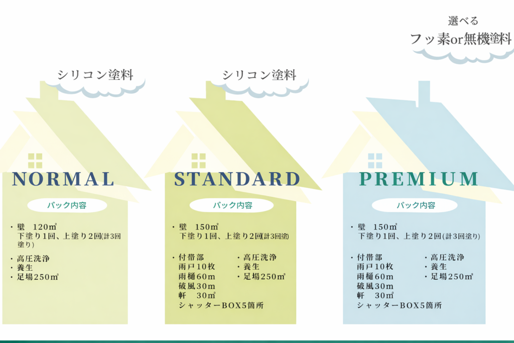 当社ではお客様にとって分かりやすい工事パックを、シリコン・フッ素・無機の3種類の人気塗料でご用意しております。
