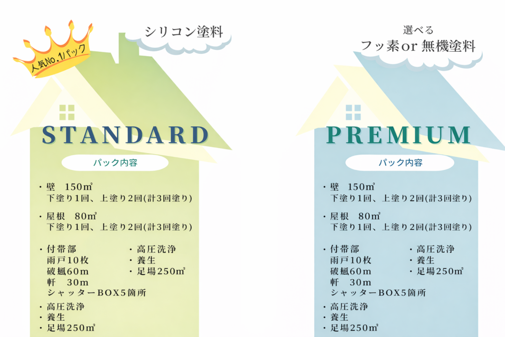 当社ではお客様にとって分かりやすい工事パックを、シリコン・フッ素・無機の3種類の人気塗料でご用意しております。